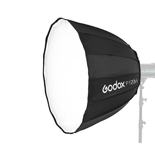 The Godox P120HE is a professional 120cm parabolic softbox designed to deliver soft, even, and directional lighting for studio and location photography. Its deep parabolic shape creates a natural wraparound light with precise control and contrast, ideal for portraits, beauty, and fashion shoots. Compatible with Elinchrom-mount lights, it ensures a secure and stable fit during use.